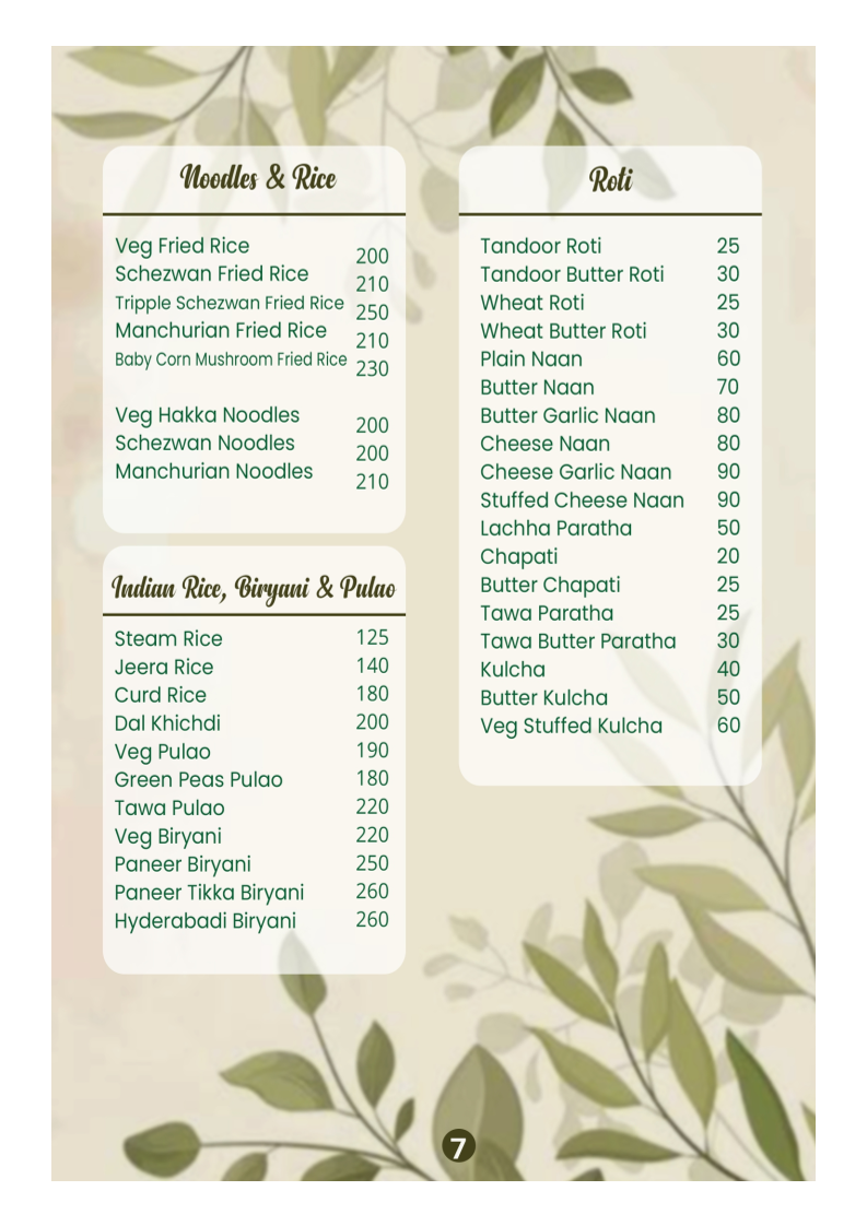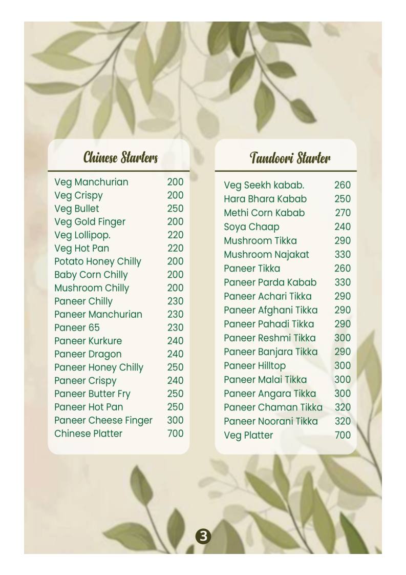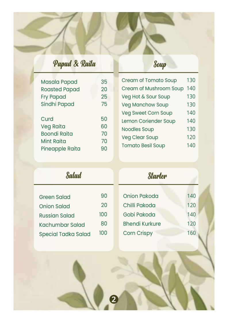 Start with warming soups like the Cream of Tomato or the flavorful Veg Manchow, ideal for a soothing beginning or a light refreshment. Fresh salads such as the Green Salad or Special Tadka Salad provide crisp, vibrant options that complement the calm, inviting atmosphere.